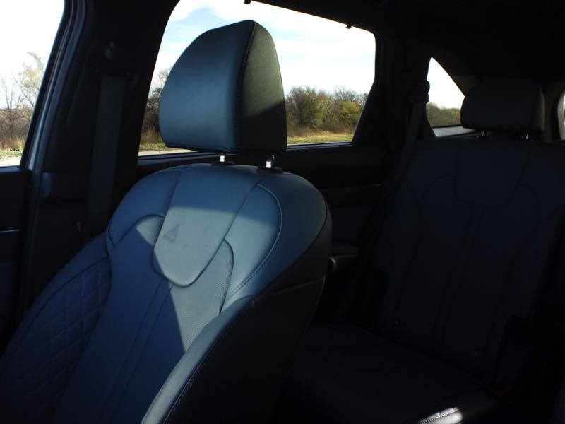The front seats are heated and ventilated, trimmed in soft leather with a SynTex suede headliner that adds a touch of luxury. The driving position is spot-on, with great outward visibility and easy access to all controls. My favorite detail is the dual-function touchscreen panel beneath the main display — a clever setup that lets you toggle between audio and climate controls with a quick tap. It’s the kind of small innovation that makes daily use easier.
